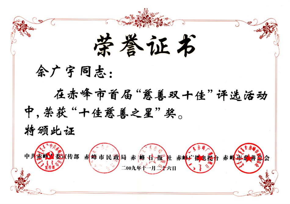 在中共赤峰市委宣传部、赤峰市民政局、赤峰日报社、赤峰广播电台、赤峰市慈善总会十一月下旬联合组织开展的赤峰市首届“十佳慈善企业”、“十佳慈善之星”及爱心单位和爱心个人评选活动中,总经理佘广宇同志荣获“十佳慈善之星”奖。