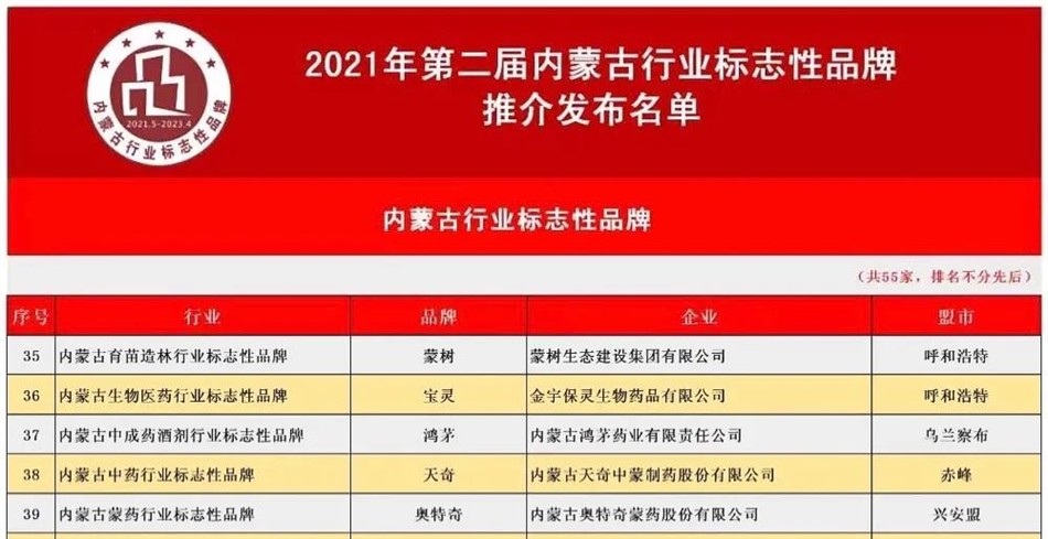 内蒙古天奇蒙药集团荣誉入选第二届内蒙古行业标志性品牌名单。