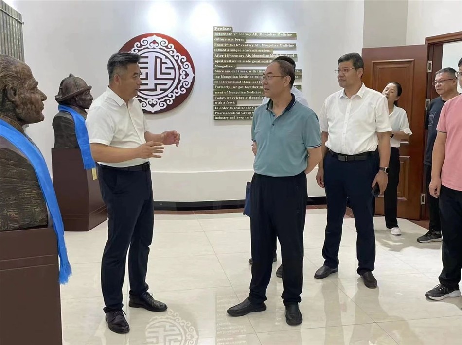 8月8日,山东中医药大学党委书记武继彪、校办主任范鹏、审计处处长/青岛中医药科学院常务副院长赵衍刚、药物研究院副院长高鹏,到内蒙古天奇蒙药集团调研。