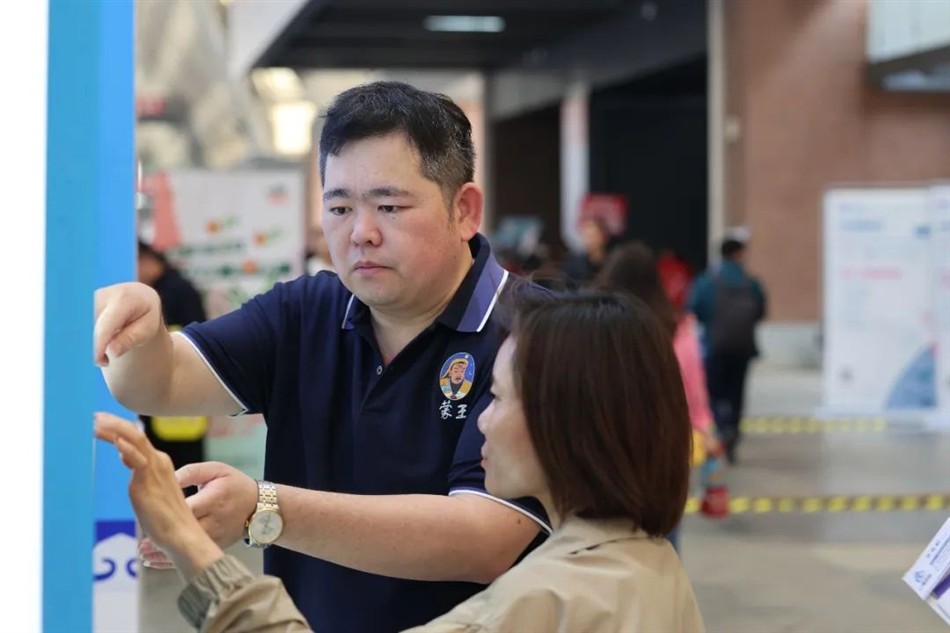 展会现场,佘总积极沟通,亲切交谈,走访其他品牌展会,求同存异汲长补短