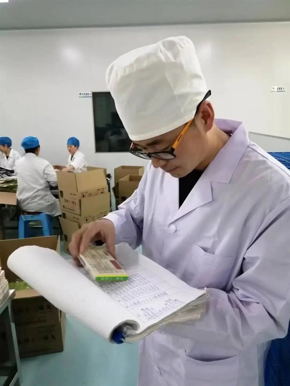 在现代制剂生产车间里于海勇主任在细致核对生产工作记录,国庆节假期和疫情期间带领生产团队坚守在一线,有力保障各项生产工作有效规避疫情影响得以正常推进,每一盒精品药都倾注了天奇人的责任与担当。
