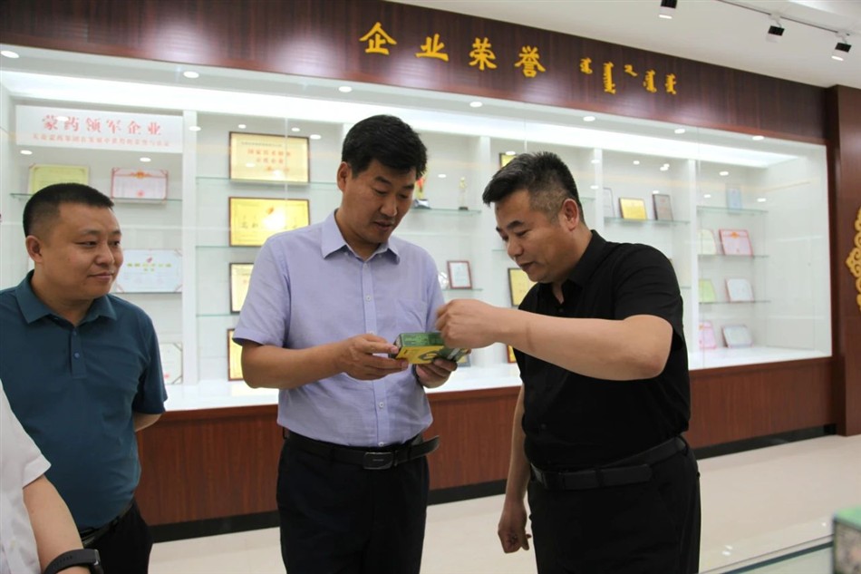 在天奇蒙药集团蒙药文化展厅,执行总裁韩风雨向张晓飞主任一行详细介绍了企业发展历程和产品情况。