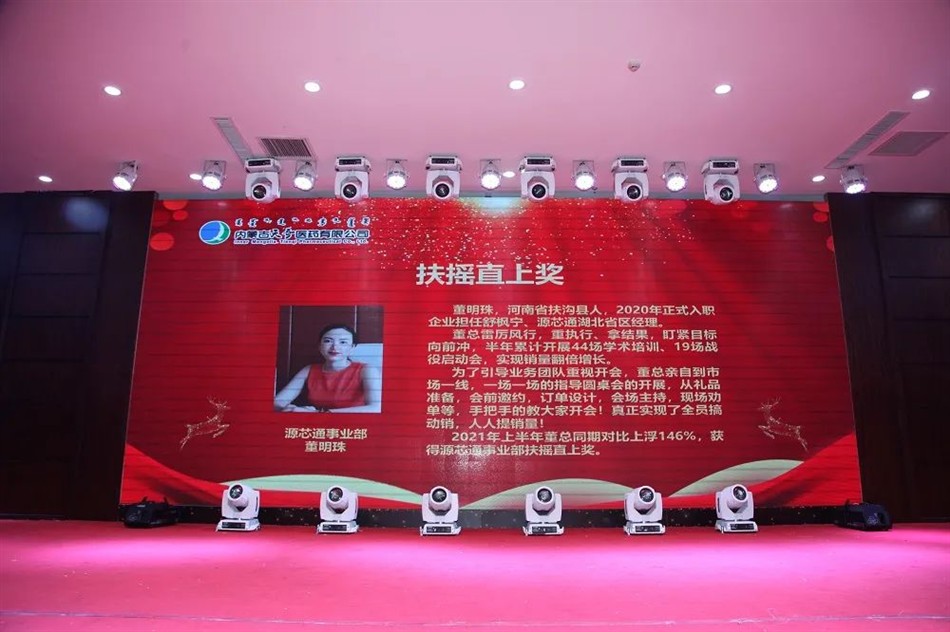 董明珠,河南省扶沟县人,2020年正式入职企业担任舒枫宁、源芯通湖北省区经理。董总雷厉风行,重执行、拿结果,盯紧目标向前冲,半年累计开展44场学术培训、19场战役启动会,实现销量翻倍增长。为了引导业务团队重视开会,董总亲自到市场一线,一场一场的指导圆桌会的开展,从礼品准备,会前邀约,订单设计,会场主持,现场劝单等,手把手的教大家开会!真正实现了全员搞动销,人人提销量!2021年上半年董总同期对比上浮146%,获得源芯通事业部扶摇直上奖。
