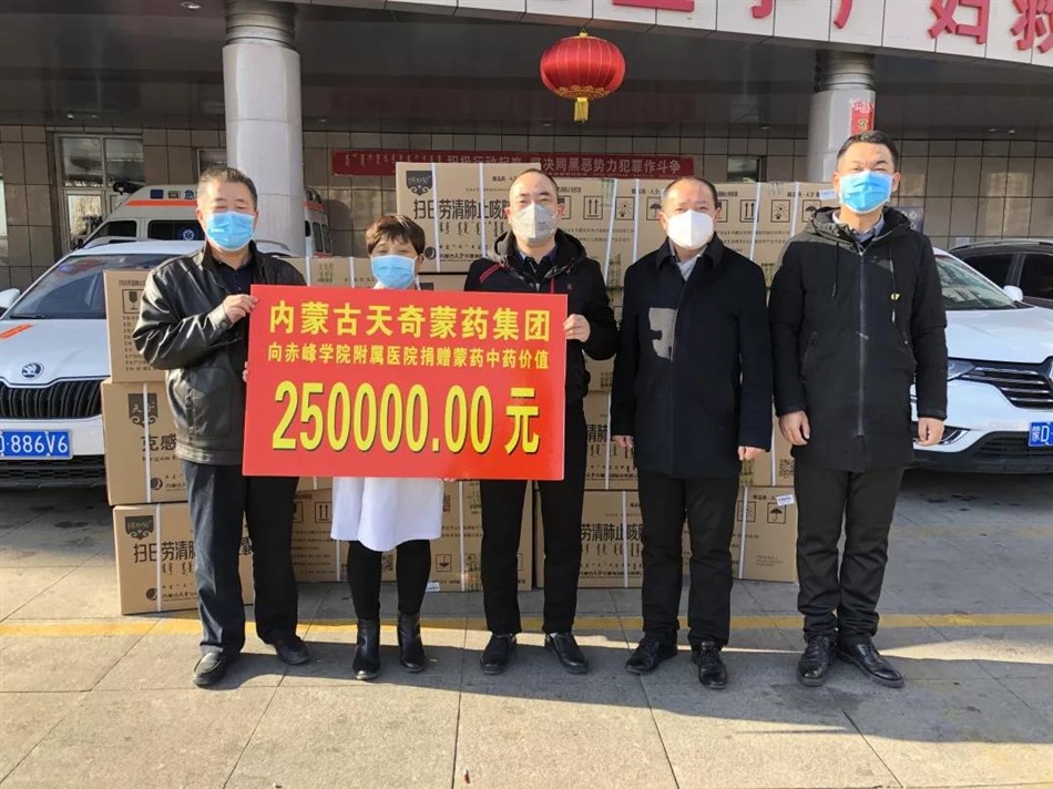 内蒙古天奇蒙药集团通过赤峰市红山区红十字会向华中科技大学同济医院、赤峰学院附属医院及赤峰松山舒心养老院捐赠100万元蒙中药品支援抗击疫情。