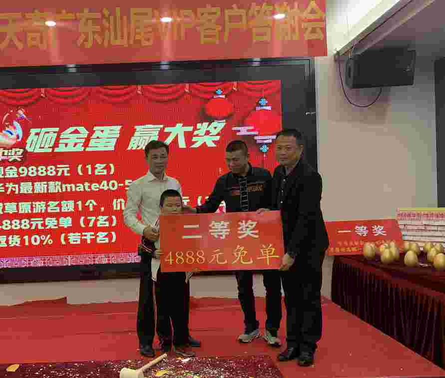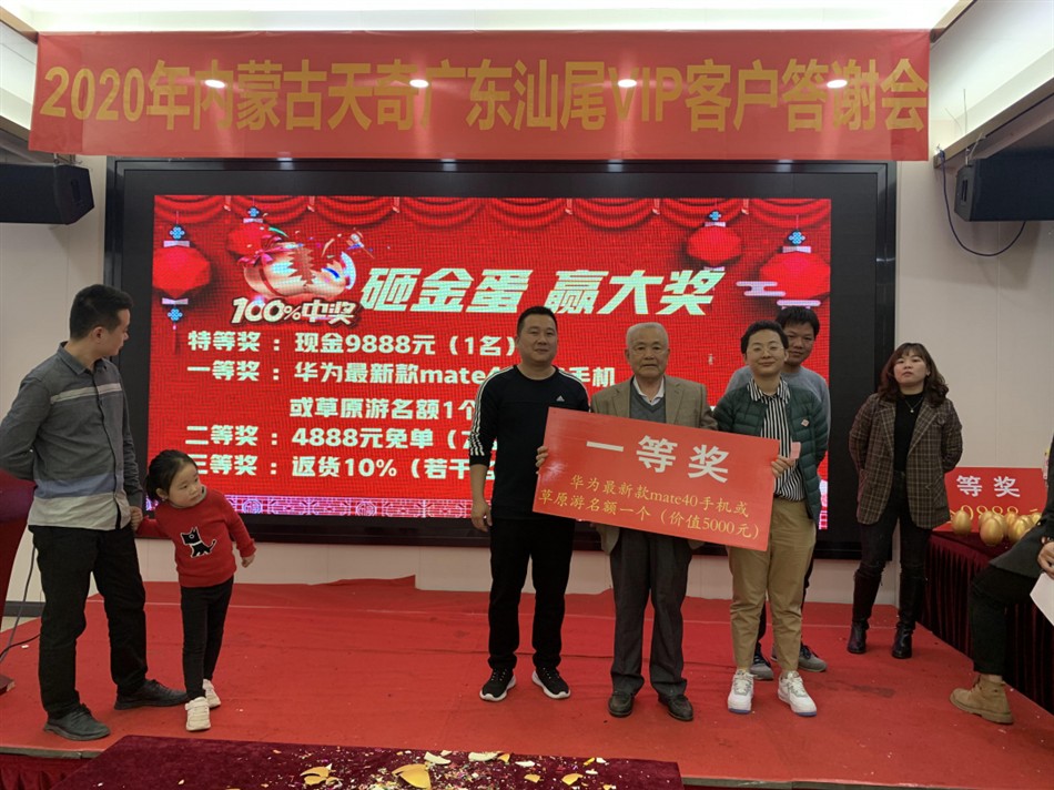 在众人的翘首以盼下,晚会在欢快热烈而充满喜庆的氛围中正式揭开帷幕,万众期待的抽奖砸金蛋活动如约而至。本次汕尾地区的VIP客户答谢会,天奇蒙药设置众多丰富奖品,包括现金大奖、最新款5G智能手机、经典草原游等,现场在一片欢声笑语中,名医们都抽到了属于自己的大奖,笑靥如花,喜不自禁。