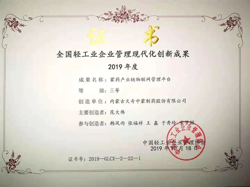 12月12日,在安徽合肥举行的2019年轻工业管理创新大会上传来喜讯,内蒙古天奇中蒙制药股份有限公司荣获“2019年中国轻工业两化融合——蒙药产业链物联网管理平台”三等奖。