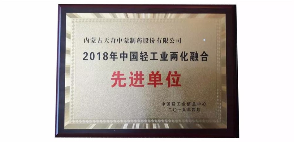 此次天奇中蒙制药被授予“2018年中国轻工业两化融合”先进单位荣誉称号,是对公司大力推进两化融合建设,努力打造信息化、工业化深度融合的现代化企业取得成果的认可。天奇中蒙制药将继续遵循两化融合发展规划,深入推进办公信息化、财务一体化、生产自动化、业务数据化建设,有效提升公司可持续竞争的新型能力。