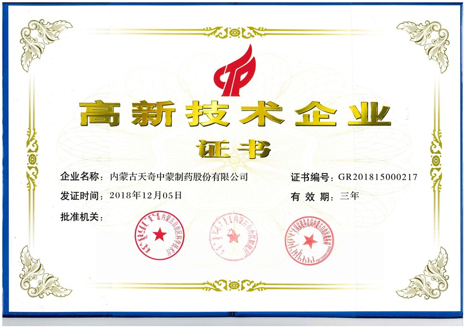 近日,内蒙古天奇中蒙制药股份有限公司通过了2018年国家“高新技术企业”认定,认定时间为2018年12月05日,有效期3年。