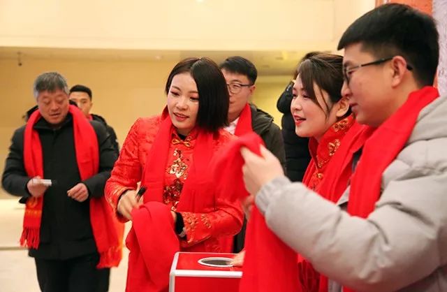 图为工作人员为天奇家人发放红围巾,喜庆的红色,寓意新的一年天奇家人们红红火火,事业兴隆。
