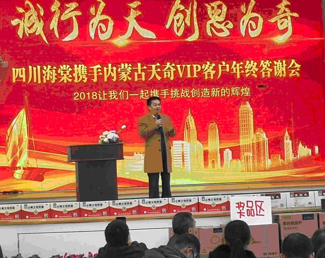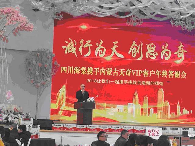 天奇中蒙制药做为海棠集团控销事业部的两个合作厂家之一,首次进入海棠大楼礼堂举办答谢会,这是迄今为止海棠所有合作厂家唯一的专场答谢会,感谢海棠集团董事长彭华清 ,答谢会拉单及追单28万元、现场订单44.43万元,总计72.43万元。