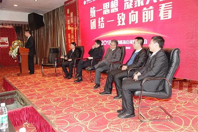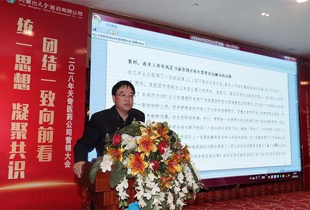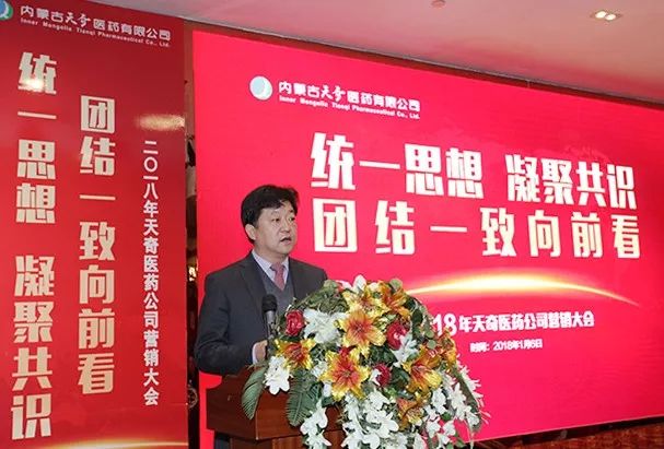 随后,天奇蒙药集团副总裁、天奇医药公司总经理佘广耀作了题为“统一思想,凝聚共识,团结一致向前看”的报告,同与会人员一起,回顾了企业13年~17年五年的营销历程,解剖了现阶段企业面临的市场挑战,解读了2018年度工作指导思想及战略举措,共同展望企业发展的愿景。