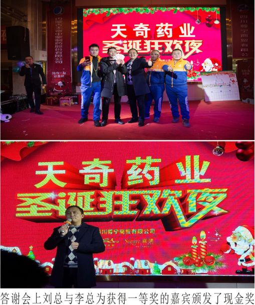 答谢会上,天奇中蒙制药代表市场部高一明作为特邀嘉宾及特邀主持人参加此次盛会,代表天奇中蒙制药市场部张云鹏总监、第四战区总经理魏建涛给在场所有嘉宾深深鞠了一躬,感谢诸位贵宾莅临本次天奇圣诞狂欢夜晚会现场,高一明对当前医药市场形式做了全面剖析,对天奇中蒙制药过去一年取得的各项成果做了汇报,并传递了“诚行为天,创思为奇”的核心价值观,解读天奇20多年来致力于为百姓提供最好的“精品药,天奇蒙药”做了阐述;对解决第三终端药房及诊所如何销售及促销和品类规划,做了深刻剖析和方案解读,他代表张云鹏总监对与会贵宾表示,2018年市场部将全面深度支援基层第三终端市场,致力于解决动销、促销、品类、单品规划与突破系统策划工作、大型活动策划组织与实施、建立三终端客户与市场部之间深度合作体系,最后幽默风趣向在场嘉宾介绍了天奇养生酒“为了健康,请喝一杯成吉思汗御用养生酒”。