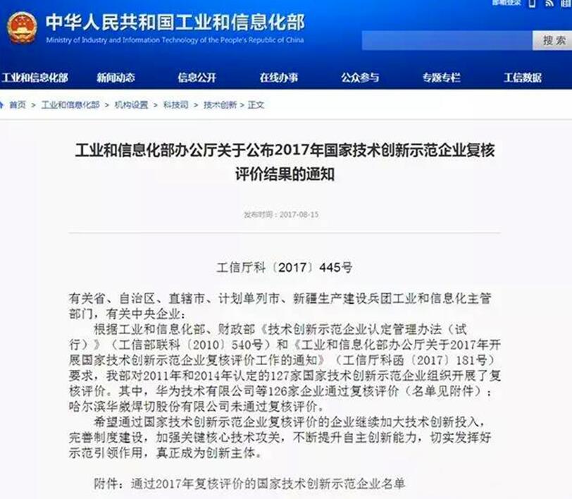 8月15日,工信部办公厅公布《2017年国家技术创新示范企业复核评价结果》,工信部对2011年和2014年认定的127家国家技术创新示范企业组织开展了复核评价。其中,内蒙古天奇中蒙制药股份有限公司、华为技术有限公司等126家企业通过复核评价;