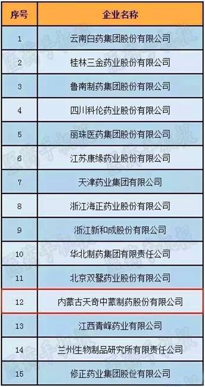 据统计,在通过2017年复核评价的126家国家技术创新示范企业中,医药企业有15家,其中包括云南白药、桂林三金、科伦药业、丽珠医药、康缘药业、海正药业、新和成、华北制药、双鹭药业9家上市药企,以及内蒙古天奇中蒙制药、鲁南制药集团、天津药业集团、江西青峰药业、兰州生物制品研究所有限责任公司、修正药业集团6家企业。
