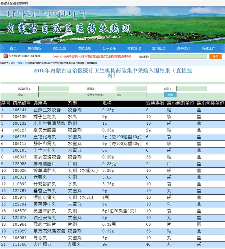 天奇中蒙制药21个品种入围2015年内蒙古自治区医疗卫生机构药品集中采购目录(第一批)