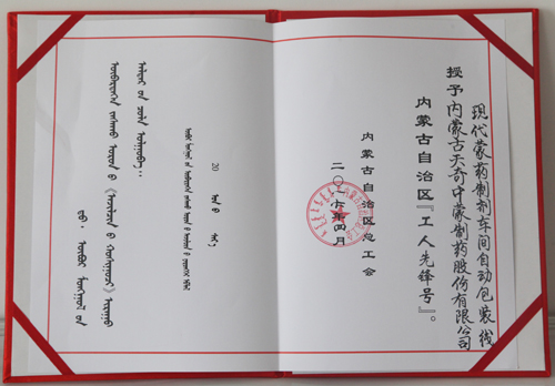 为更好地发挥劳模和先进班组的示范引领作用,近日,内蒙古自治区总工会授予天奇中蒙制药现代蒙药制剂车间自动包装组“工人先锋号”荣誉称号。