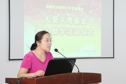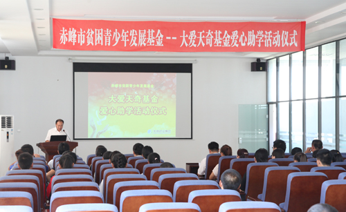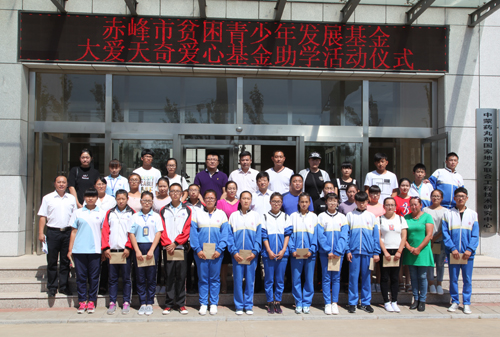 8月22日,由共青团赤峰市委员会与天奇药业集团联合发起的“赤峰市贫困青少年发展基金会——大爱天奇基金”爱心助学活动仪式,在天奇中蒙制药公司举行。共青团赤峰市委员会副书记鲁秀清、青工农牧部副部长展天戈,共青团喀喇沁旗委员会书记傅国华、青工部部长王磊出席仪式。天奇药业集团向赤峰市的34名贫困青少年捐资助学11万元,其中研究生每人每年8000元、大学生每人每年4000元、高中生每人每年2000元。