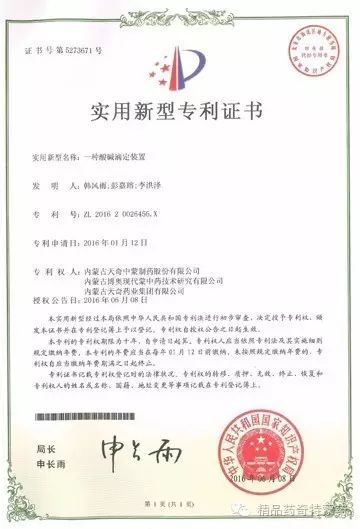 日前,天奇药业集团的一项发明专利获得国家知识产权局授权,此项专利为“那如三味丸的检验方法”;一项实用新型专利获得国家知识产权局授权,此项专利为“一种酸碱滴定装置”。