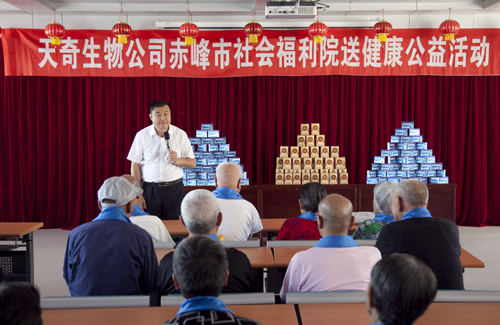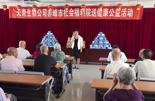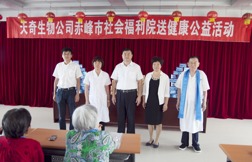 “天气这么热,你们还记挂着我们,给我们送那么多东西,大伙心里高兴着呢!“赤峰市敬老院的老人拉着天奇药业集团前来慰问的党员代表的手说。在敬老院,党员代表们详细了解了老人的身体健康状况和生活情况,与老人们亲切交谈,嘱咐老人多注意身体,并为老人们送上了天奇生物公司生产的价值2万多元的骨多肽、陆尔草聚邦片等保健产品,祝愿老人们健康长寿。