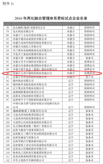 在工业和信息化部办公厅公布的2016年两化融合管理体系贯标试点企业名单的通知中,天奇中蒙制药赫然在列。