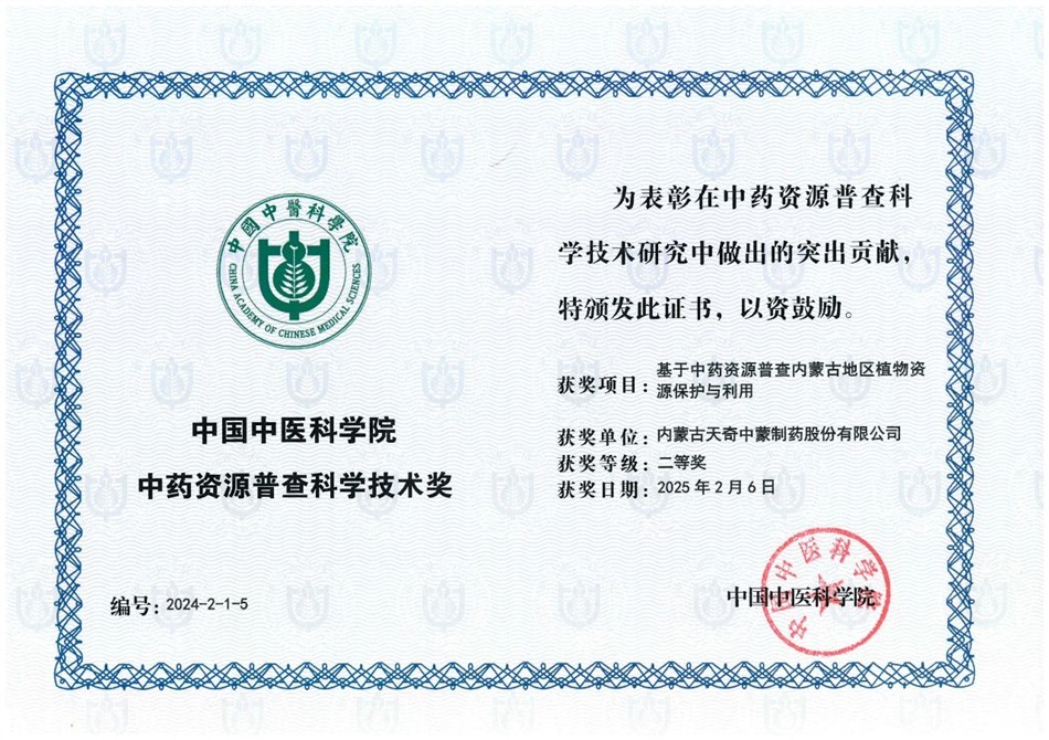 近日,内蒙古天奇中蒙制药股份有限公司与内蒙古自治区中蒙医药研究院、内蒙古自治区中医医院等单位联合申报的《基于中药资源普查内蒙古地区植物资源保护与利用》项目荣获2024年度中国中医科学院中药资源普查科学技术奖二等奖。