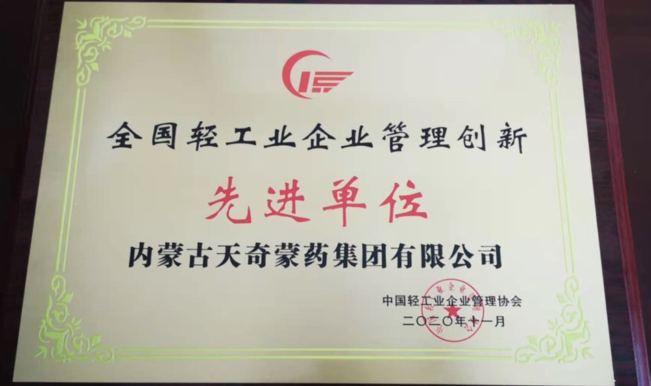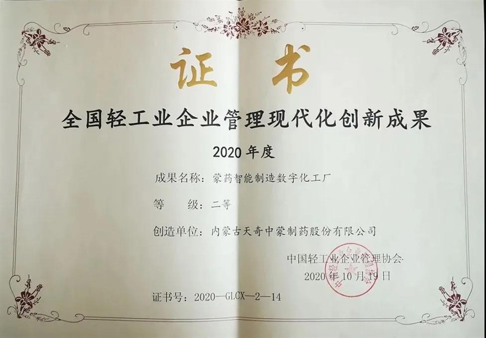 11月26日,中国轻工业企业管理协会第五次会员大会在北京召开,会议对2020年度轻工企业管理现代化创新成果和企业管理创新先进单位进行了表彰。内蒙古天奇中蒙制药股份有限公司 “蒙药智能制造数字化工厂”管理现代化创新成果获得二等奖,内蒙古天奇蒙药集团有限公司荣获“全国轻工业企业管理创新先进单位”。